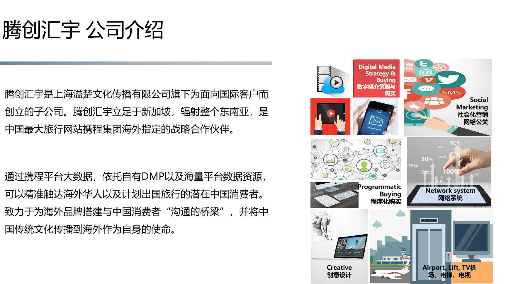 騰創(chuàng)匯宇是上海溢楚文化傳播有限公司旗下為面向國際客戶而創(chuàng)立的子公司。騰創(chuàng)匯宇立足于新加坡,輻射整個東南亞,是中國最大旅行網(wǎng)站攜程集團海外指定的戰(zhàn)略合作伙伴。